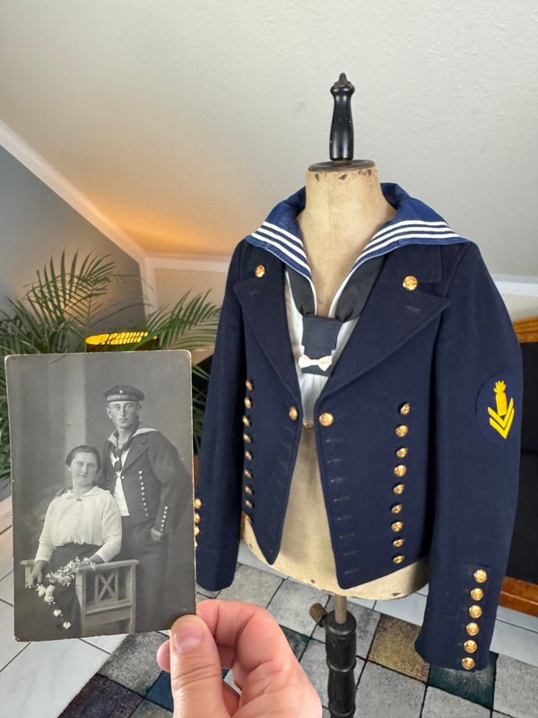 Between 1914 and 1919, women’s dresses reflected the profound impact of World War I on fashion. Early in the period, styles retained Edwardian elegance with high waists, tunics, and flowing skirts. As the war progressed, practicality in fashion took precedence - hemlines rose to mid-calf, silhouettes narrowed, and embellishments were pared down. Military-inspired fashion details like belts and epaulets appeared, while softer fabrics and simpler cuts suited women’s expanding roles in workwear and society. By 1919, dresses featured clean lines, natural waists, and a restrained grace that bridged tradition and modernity.